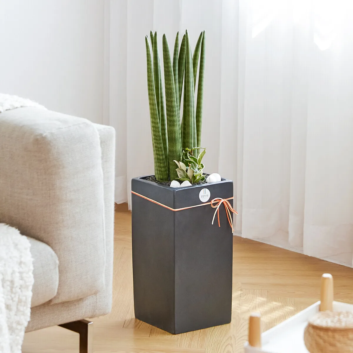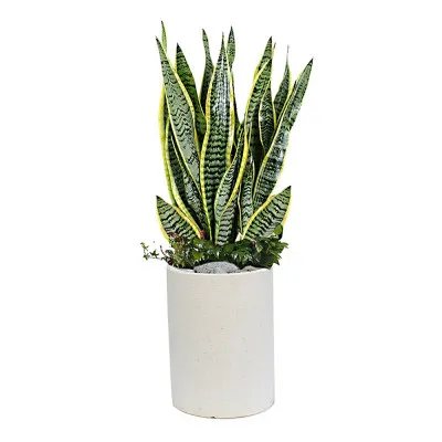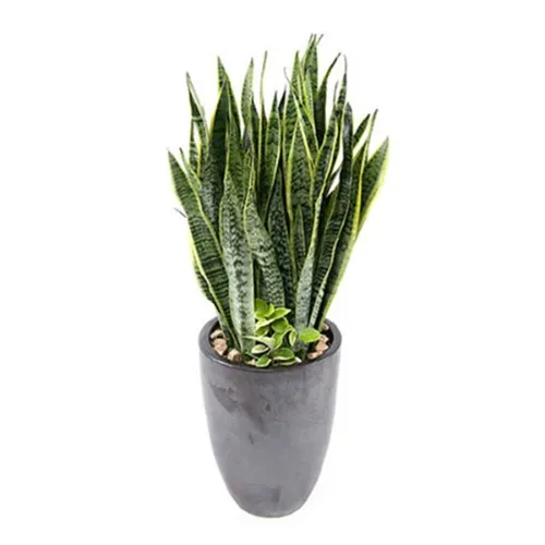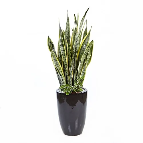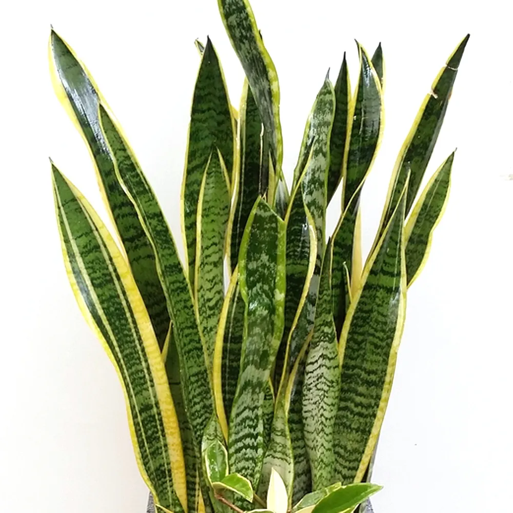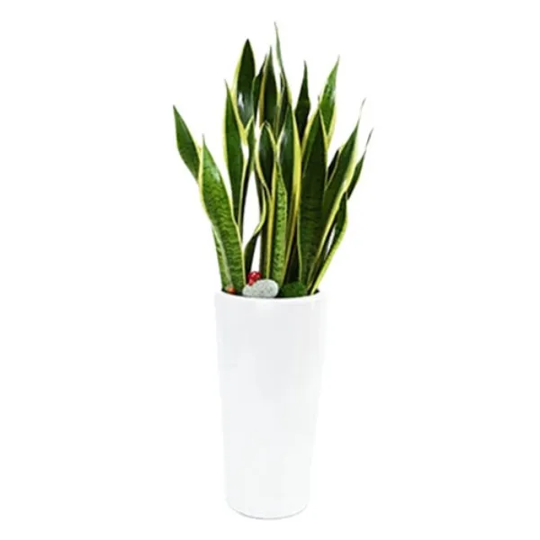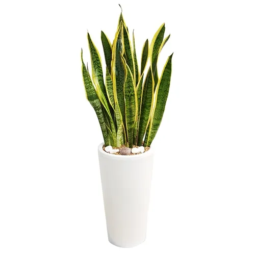 산세베리아는 두꺼운 잎에 수분을 저장하는 다육식물로 공기 가습에 탁월한 효과가 있는 것으로 잘 알려져 있습니다. 또한 음이온을 방출하여 뛰어난 공기 정화 기능을 갖고 있습니다. 대부분의 식물과 달리 밤에도 이산화탄소를 흡수하고 산소를 방출해 특별한 식물입니다. 실내에서 꽃을 피우는 것은 어렵지만 유리한 조건에서는 하얀 빛의 작은 꽃을 피울 수 있으며, 꽃이 피면 행운이 온다는 낭만적인 믿음도 있습니다.