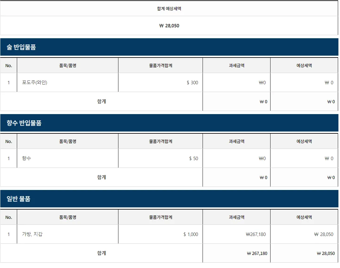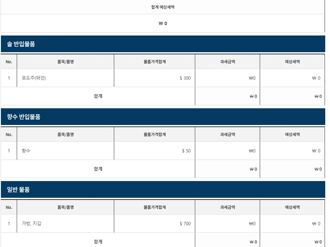 면세 한도를 초과하는 경우의 예상 세금은 관세청의 세금 계산 시스템을 통해 계산할 수 있습니다. 이 시스템을 사용하여 구매한 제품의 정보, 구매 국가 및 금액을 입력하면 예상 세액을 쉽게 확인할 수 있습니다.